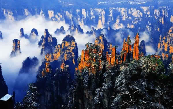 御筆峰 御筆峰被公認為是武陵源砂巖大峰林風光的標志景點,不斷出現(xiàn)在海內外各種媒體和宣傳品上面,堪稱天下一絕。本來,這是大自然鬼斧神工的神來之筆,科學上講是歲月風化、浸蝕、切[1]削的結果,但民間卻把它與向王天子聯(lián)系在一起,說是向王天子殉難后,他的御筆化成石峰,廝守在神堂灣邊;而裝御筆的“簽筒”、“筆架”則留在水繞四門。然而,千古興亡,時代更迭,“古今多少事,都付笑淡中”。只有這支“御筆”還在!在詩人眼中,好用它來寫瀟瀟灑灑的霧,寫多姿多彩的云,寫火一般熱烈的朝霞,寫夢幻般純潔的月光,寫“高處不勝寒”的冰雪世界。當然,也可以寫您熱戀這方山水或者熱戀某位紅顏知己的情詩。