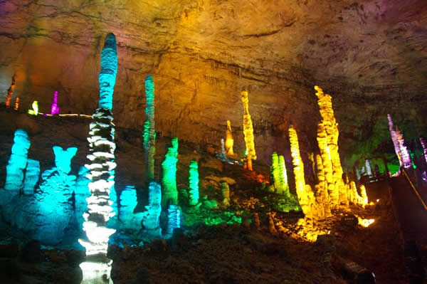 黃龍洞位于索溪峪東面,被稱為“地下魔宮”,洞口霧靄迷漫,洞內(nèi)長(zhǎng)廊蜿蜒,鐘乳懸浮,石柱石筍林立,還有石簾、石幔、石花、石琴,琳瑯滿目,異彩紛呈,令人目不暇接。“洞外洞”、“樓外樓”、“天外天”、“山外山”,盤(pán)根錯(cuò)節(jié)。黃龍洞內(nèi)可分四層,水陸并進(jìn),從最低陰河至最高穹頂,垂直高度差有100多米,洞內(nèi)有一個(gè)水庫(kù)(黃龍水洞)、二條陰河(響水河、水晶河)、三個(gè)地下瀑布(黃龍瀑、天水瀑、天地瀑)、四個(gè)水潭、十三個(gè)廳(宮)(龍舞宮、水晶宮、迷人宮……)、九十六條游廊,長(zhǎng)度約達(dá)15公里,最大的廳堂有12000平方米,可容納萬(wàn)人。真可謂是洞中乾坤大,地下有洞天。入黃龍洞,如入人間仙境一般。
