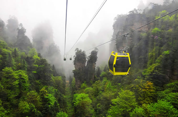楊家界風(fēng)光 楊家界索道是世界自然遺產(chǎn)武陵源風(fēng)景名勝區(qū)繼天子山索道、黃石寨索道后的第三條客運(yùn)索道,上站位于八里坡游覽線劉家檐,下站位于中湖鄉(xiāng)野溪鋪村。該索道采用法國玻瑪索道設(shè)備,是世界頂級(jí)雙回路循環(huán)式配置八人車廂式索道,全長(zhǎng)1876米,上下站垂直高差517米,線路支架14個(gè),最高運(yùn)行速度6m/s,最大運(yùn)力為2300人/小時(shí),單程運(yùn)行時(shí)間5.2分鐘,是目前國際最先進(jìn)的客運(yùn)索道。
