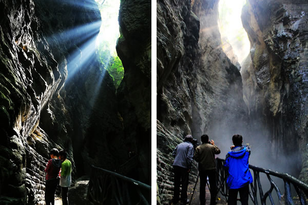 俯身這超然脫俗的雪花溪水,有點思想上的蒼白。這是人間之水?那樣的虛幻,那樣的飄逸,那樣的晶瑩透澈。靜靜地流淌千年,晃動水底的鵝卵石,飄搖水面的落花,驚恐狀橫行的螃蟹。這溪水從老道灣山洞、森林漫溢出來,以峽谷崖石階梯為舞,以原汁的原始荒野為伴,時而輕歌時而喧嘯。宛如一條白絹自天而降,串就老道灣峽谷潭與瀑、谷與水、天人合一的自然美景。 走在這里,我們可以感到陣陣涼風吹來,這里的溫度要比其他地方的溫度低大約5、6度,夏季,這里更是游客的避暑勝地。每一潭都有一個美麗的故事。