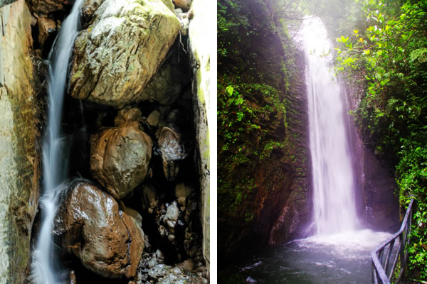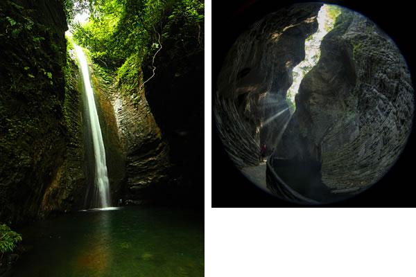 西線原名叫雪花溪,又叫雪花洞,水從懸崖上掉下來濺起水花,泉水與巖石相碰,落成大霧,形成雪花狀,故名雪花溪。因地勢險峻,歷代人都沒有把雪花溪走通過,從下往上看深不見底,古人以為是一個洞,故又叫雪花洞,其實是一個峽谷,有七潭七瀑,現在叫“仙女峽谷”。峽谷長800米,最窄處僅1米左右,上下落差近200米,因水的長期回旋沖刷, 巖層的堅硬度各異,形成了底寬頂窄,時北,時西,時東,陰暗無光,形似溶洞, 泉水飛流直下,形成梯級瀑布,擊打在巖壁上濺起的水花猶如雪花飛舞,潭中一片雪白,古人稱之為雪花洞,峽谷中有七個各異的潭池在沖擊的水花中若隱若現,故改稱為七仙女人間沐浴瑤池,從開天辟地起無人行通過,現在已修好的占道,于峽谷水花之中,幻入仙境之感。